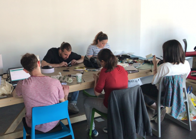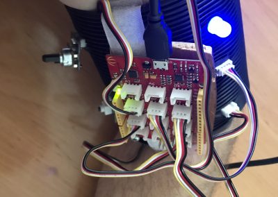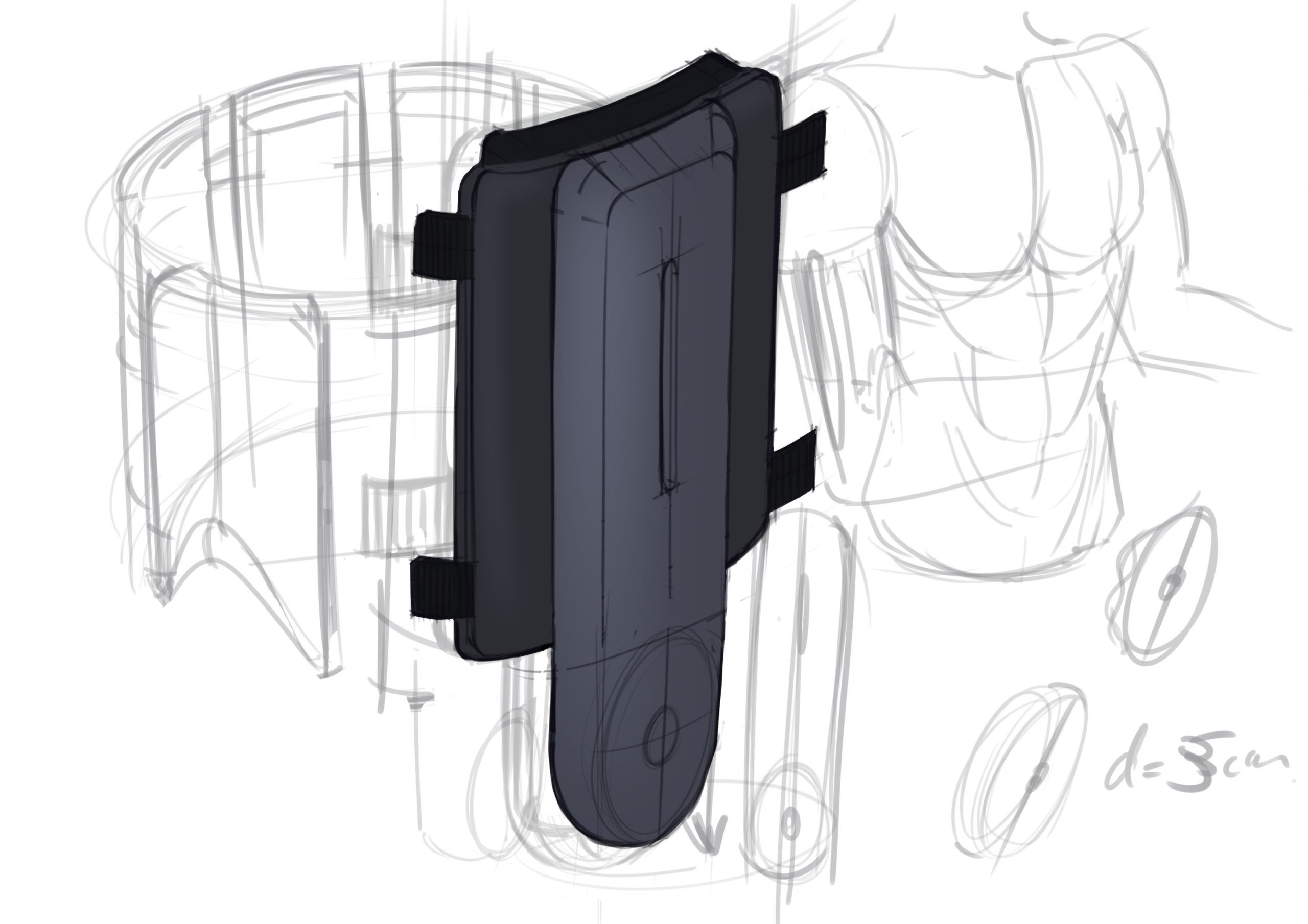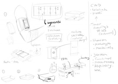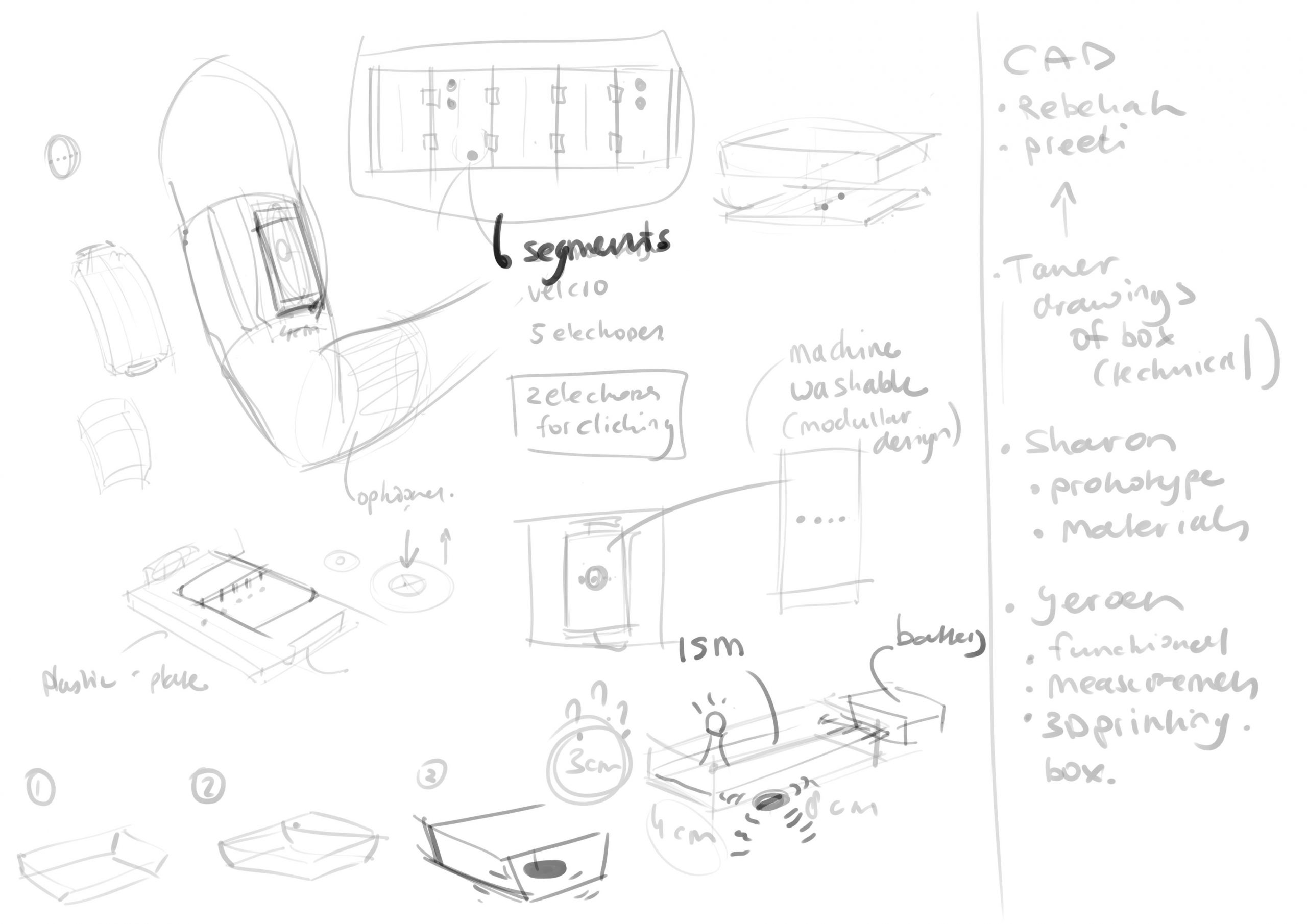 After getting an idea on how the subsystems were a connected and interacting, we then started a co-creation session on how they all were integrated. Starting out with the hardware: one board with a battery and a Bluetooth receiver. Next, a schematic helped us to create the first shapes of the electronics encasing. Lastly the connection to the band-attachment was developed.