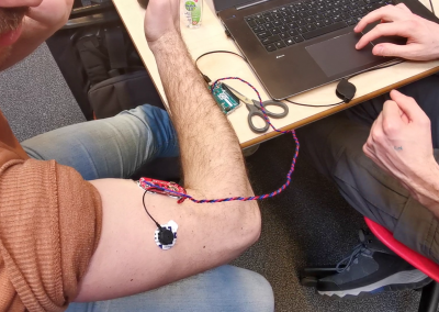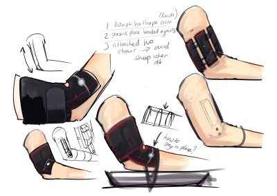Through literature research and testing, the muscles in which the EMG sensors were to be placed were selected. Then prototypes were developed, with each design iteration having focus areas. These areas include ergonomics, pressure sensitivity, product experience, electronics integration, material testing, attachment and placement, cleaning, and not interfering with existing equipment.