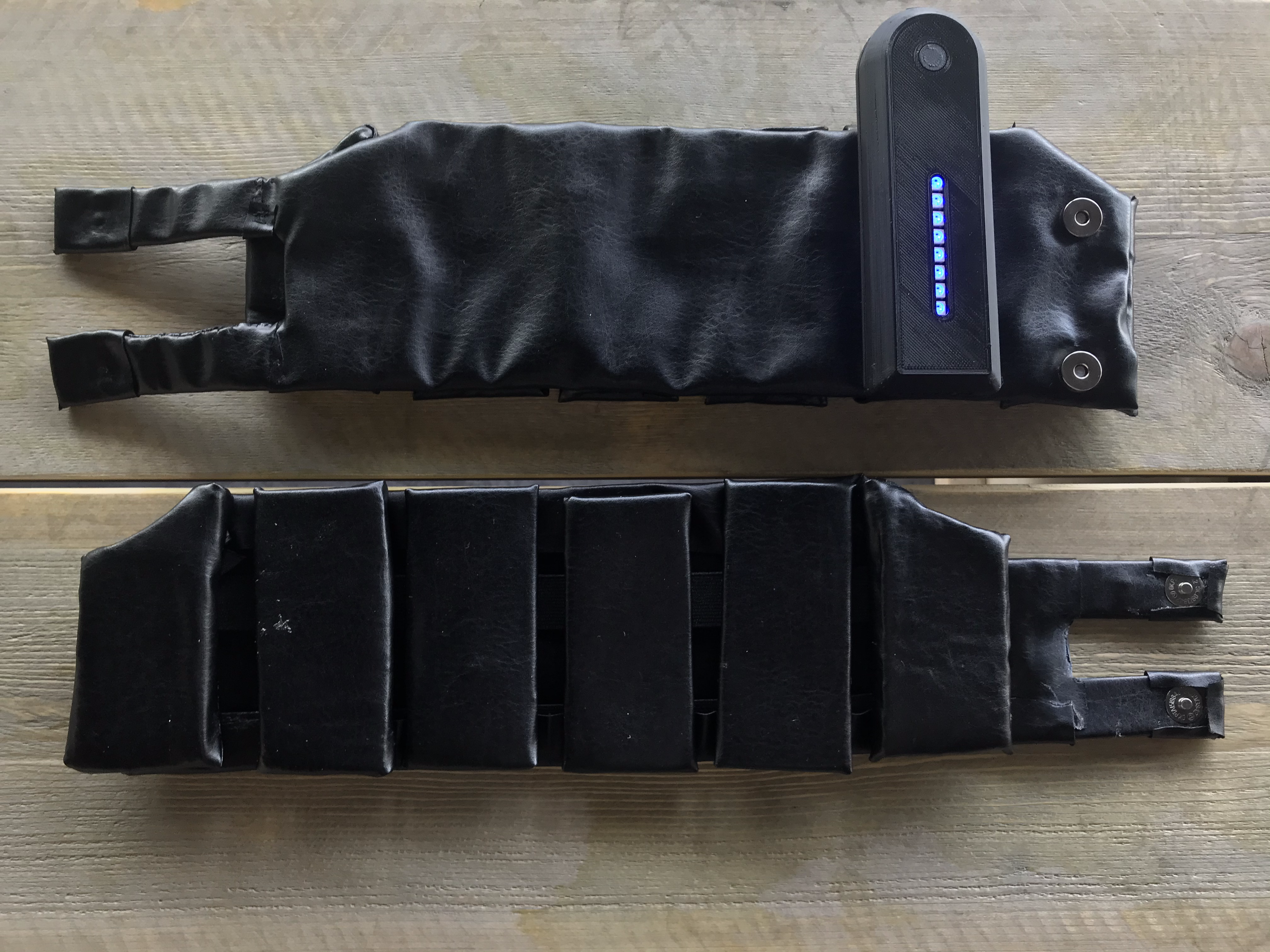 The tools used for this project consisted of foam neoprene/soft plastics, faux leather, card board, Velcro, thread, rubber, Lycra/Spandex, dry electrodes(EMG Sensor) and Arduino. The apps we used were Photoshop, Arduino IDE, After Effects, Illustrator, Solidworks, Ender Creality and Google Forms.